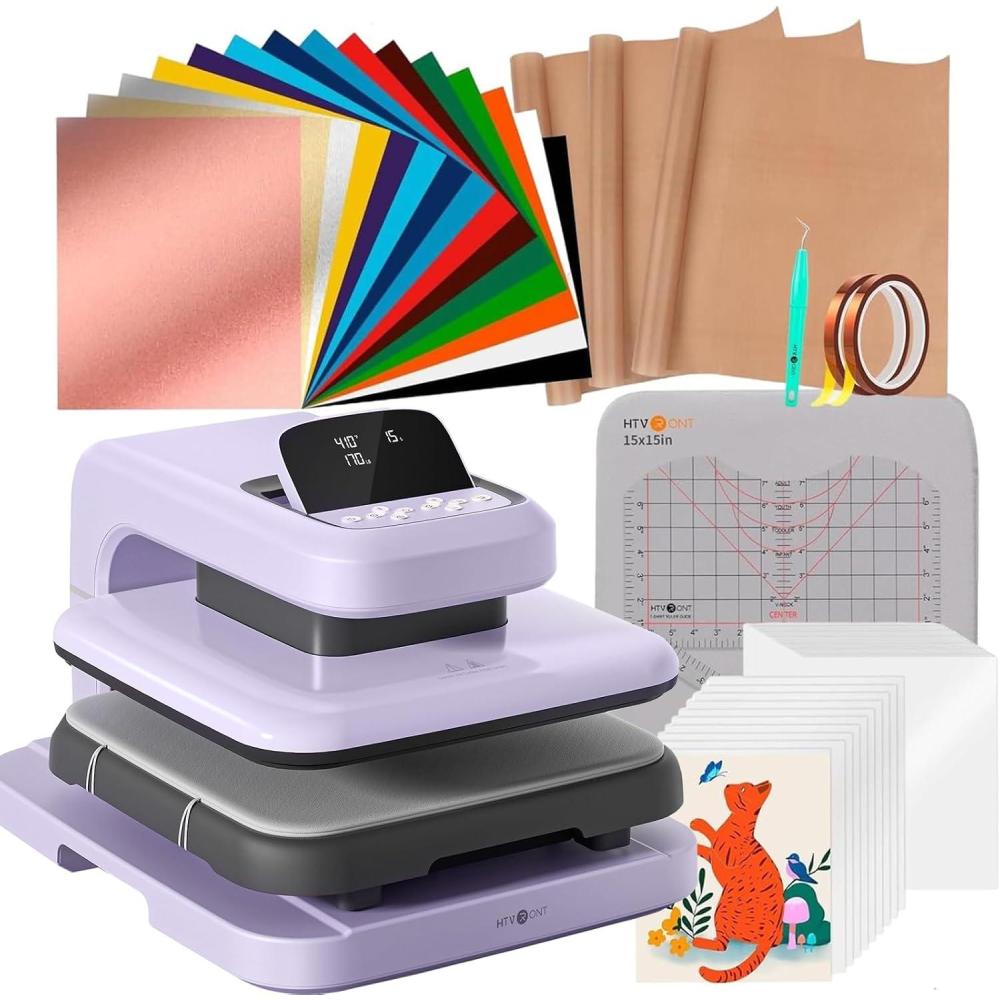 【Bundle Contains】HTVRONT Automatic heat press 2, HTVRONT Automatic Heat Press Accessories Kit (Include: T-shirt rulers*1, weeding hooks*1, 15X15 heat press mat*1, 2 Rolls heat tape, 3 pack Teflon Sheets, 15 pack heat transfer vinyl, 20 pack 8.5*11″ sublimation paper, 20 pack sublimation HTV for dark fabric)