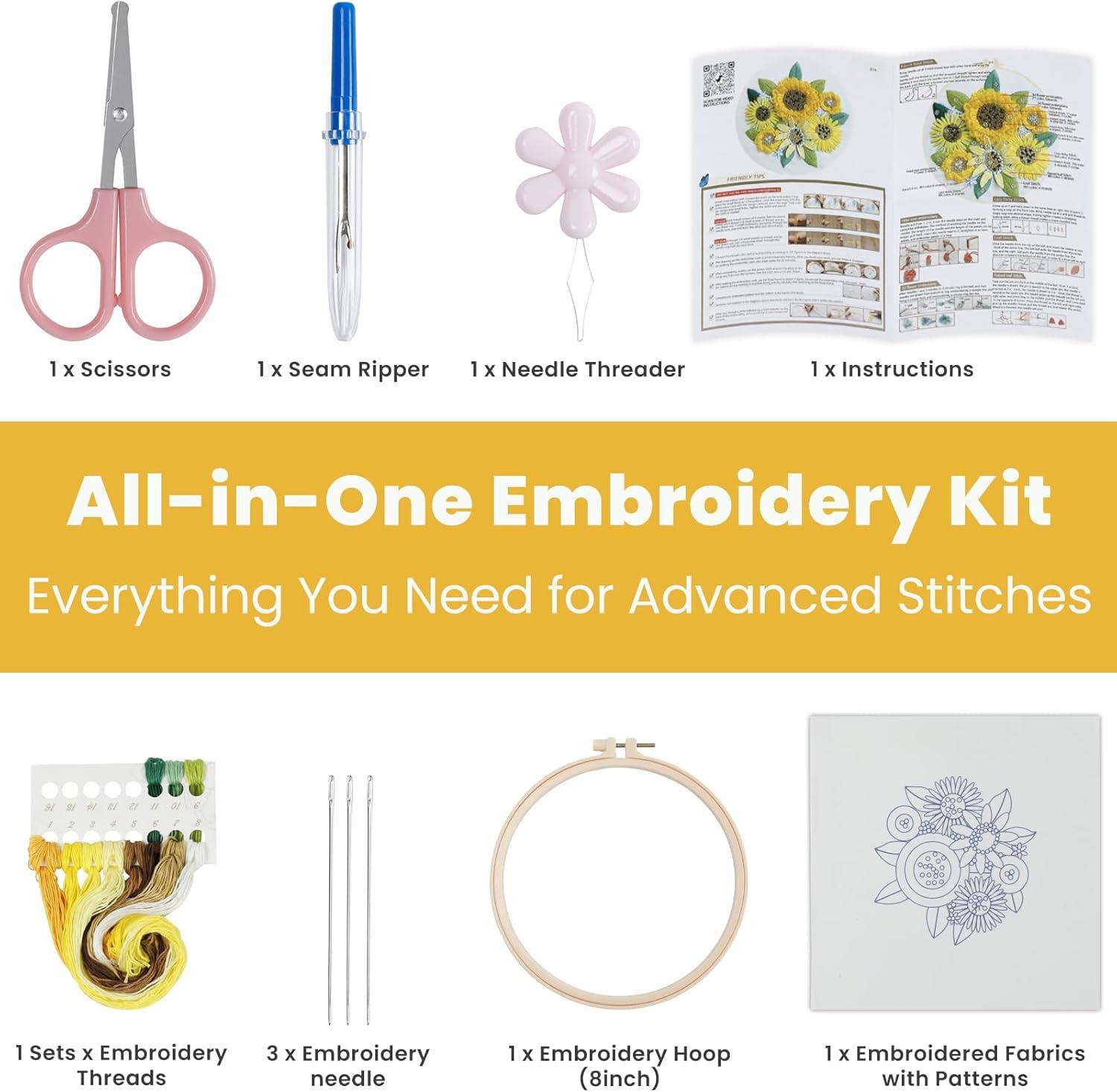 WHAT YOU WILL GET: You will receive everything you need to start your embroidery journey, including:1*Embroidery Hoop, 1 * Embroidered Fabrics with Pattern, 1 set of Embroidery Threads,1* Needle Threader,1* Instruction,1* Seam Ripper,3* Embroidery Needles, 1*embroidery scissors. We provide 120% of the embroidery thread needed to complete the work, so you'll never have to worry about running out of thread halfway through