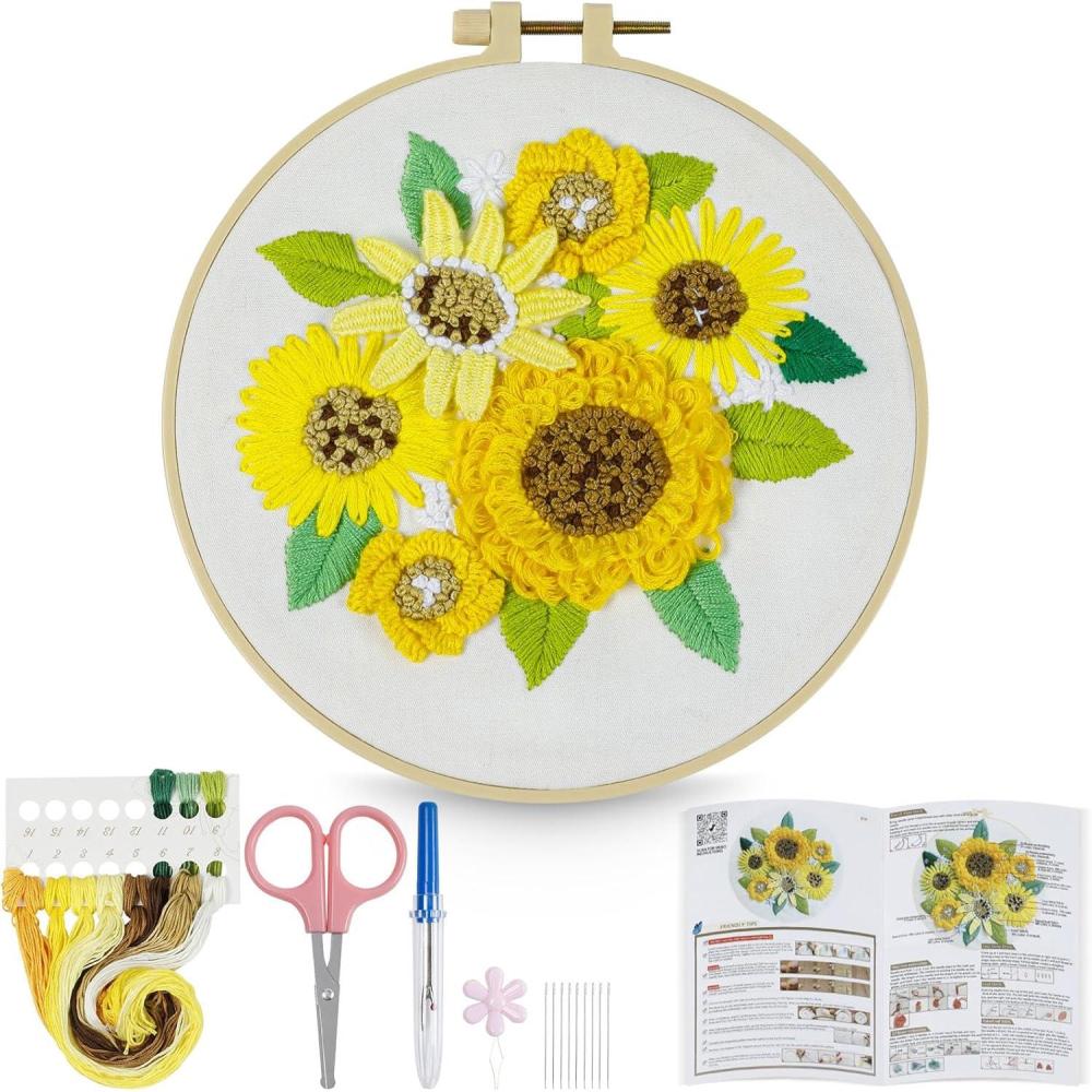 HTVRONT 3D Embroidery Kit for Beginners- Sunflower Embroidery Kits with Step-by-Step Video Tutorials, 3D Art Finished with 5 Stitches, Beginner Embroidery Kit for Adults for Denim Jackets, Home Decor(Sunflower Patterns)