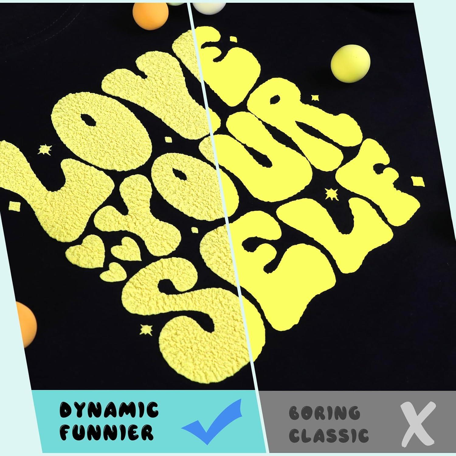 【Wide Range of Applications】 HTVRONR black 3D puff heat transfer vinyl is suitable for a wide range of fabrics, such as polyester, cotton, polyester/cotton blends, modal cotton, spandex, lycra, denim, etc. The unique fluffy effect of the black 3D htv puff vinyl is not only an eye-catching embellishment on fabrics, it is also the preferred choice of gifts for festivals, anniversaries, and interactive family events