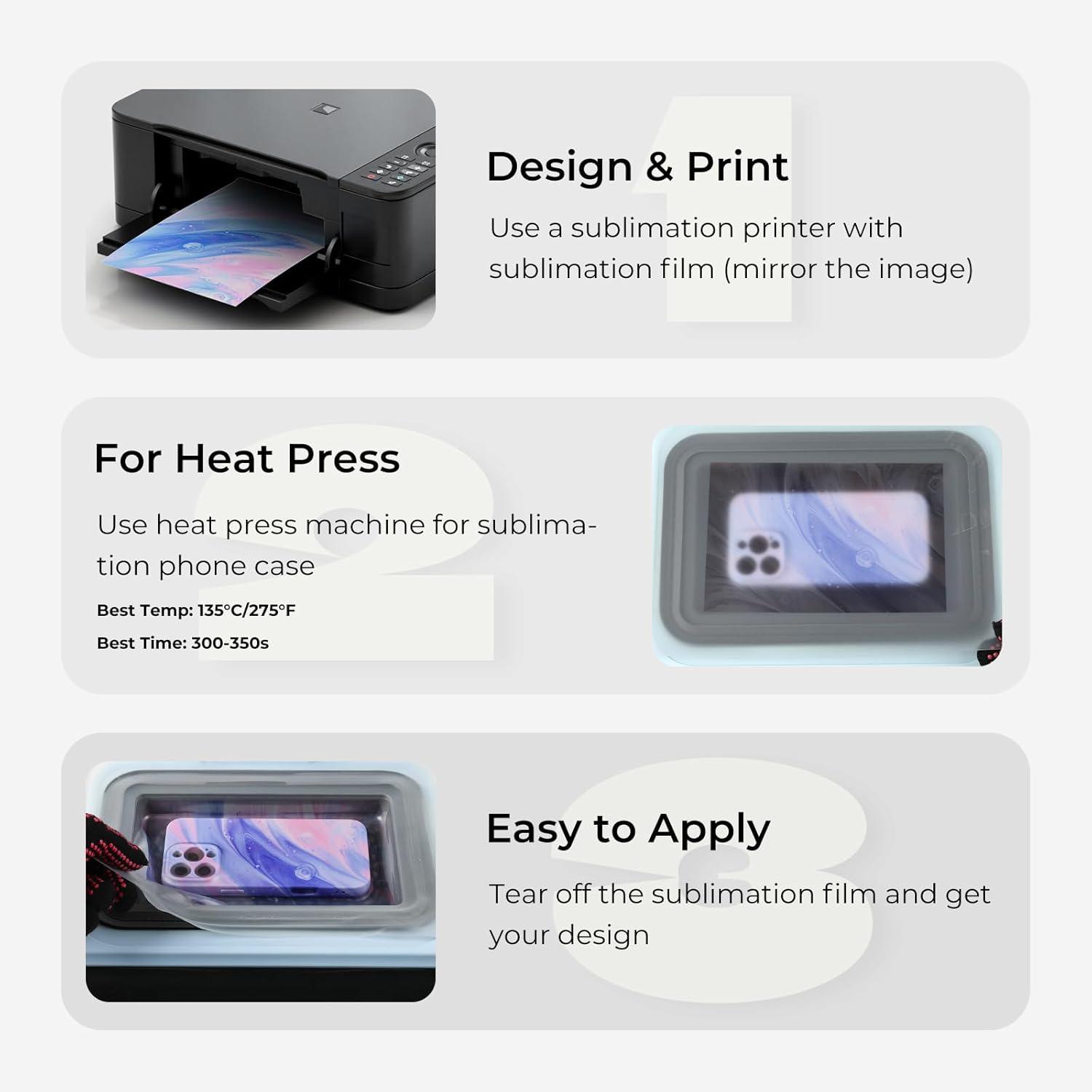 【Easy to Use】First, print your pattern (mirrored) using a sublimation printer. Then, place the sublimation film's matte side down onto the sublimation phone case blanks and begin heat pressing (Recommended temperature: 135°C/275°F for 300-350 seconds). Once heat pressing is complete, peel off the sublimation film to reveal a vibrant, custom-printed phone case.