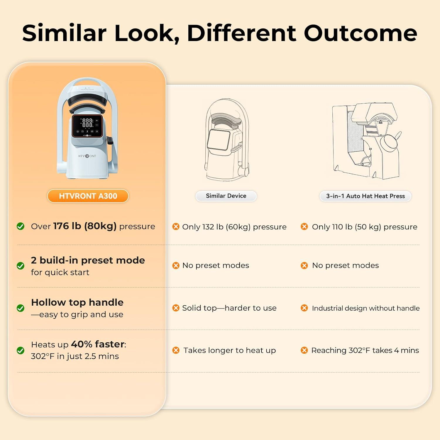 Precise Temp & Time Control & Even Heat for Pro Result: The HTVRONT A300 auto hat heat press features an intuitive touchscreen for precise control of temperature (104–410°F / 40–210°C) and time (1–999 s). In addition, the auto hat press's cast-aluminum heat plate heats rapidly and distributes heat evenly across the plate, ensuring smooth transfers without cold spots, while the PTFE coating further helps prevent sticking, delivering flawless press results every time.