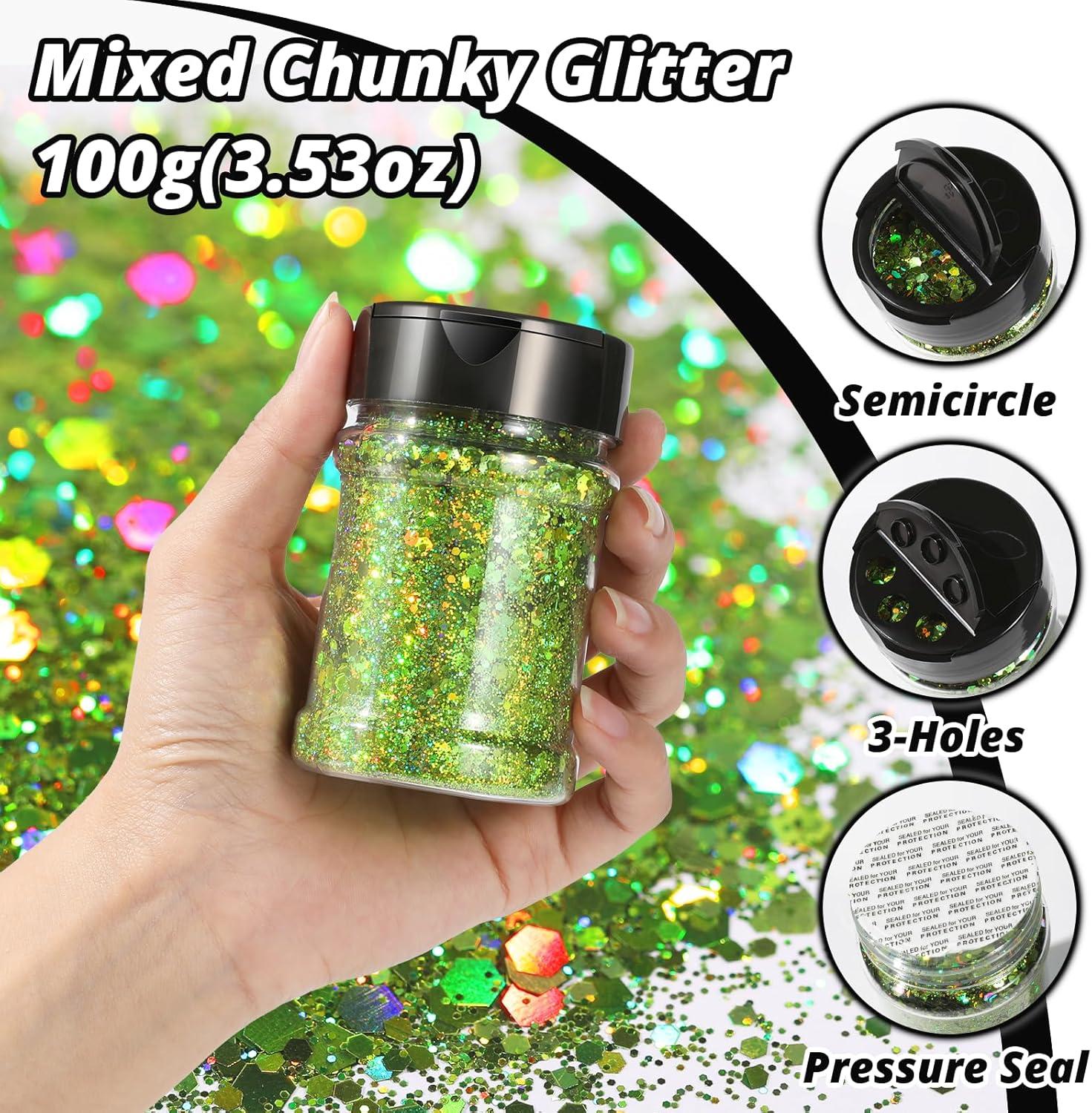 LARGE BOTTLE FOR WIDE USAGE. 100g/jar(2.17*3.35inch), this chunky glitter for resin is suitable for long-time use. Meanwhile, our excellent chunky glitter displays high compatibility with resin, tumblers, nails, decor, painting, scrapbooking, jewelry, school projects, etc. This holographic glitter chunky works well with glue and epoxy to make sparkle crafts, which let your artworks stand out beautifully
