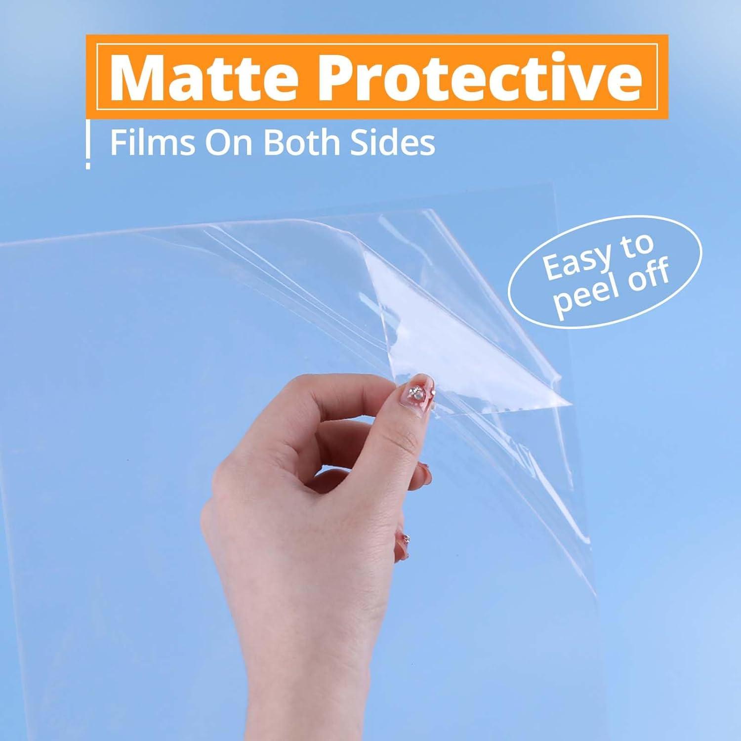 CRYSTAL CLEAR AND ANTI-SCRATCH. HTVRONT plexiglass sheets are made of recyclable high-quality plexiglass material, which is a material similar to glass and it has excellent transparency and clarity. Each clear plastic sheet has a detachable mist white PE cover on both sides, please peel them off before use