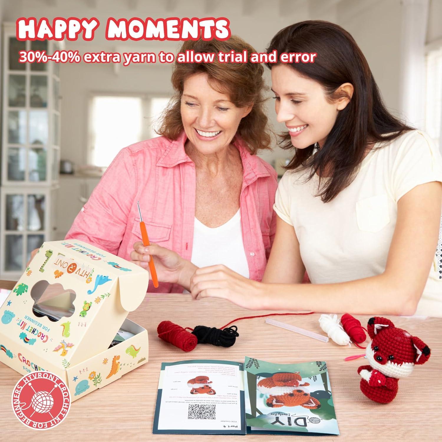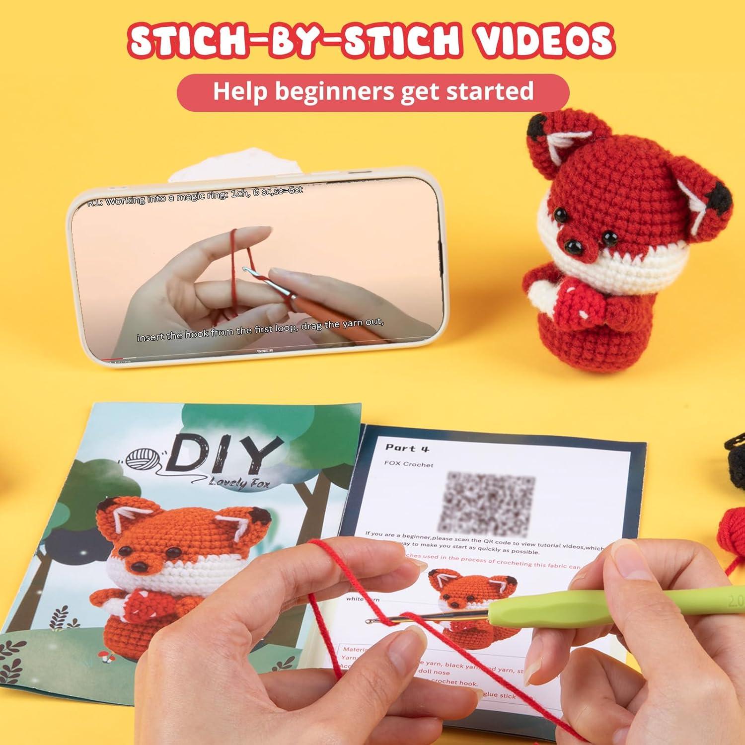 HTVRONT Crochet Kit for Beginners - Starter Crochet Kits with Video Tutorials, Beginner Crochet Kit for Adults Kids Gift - Learn to Crochet Stuffed Animals Knitting Kit Penguin Family(30%+ Yarn)(Fox)