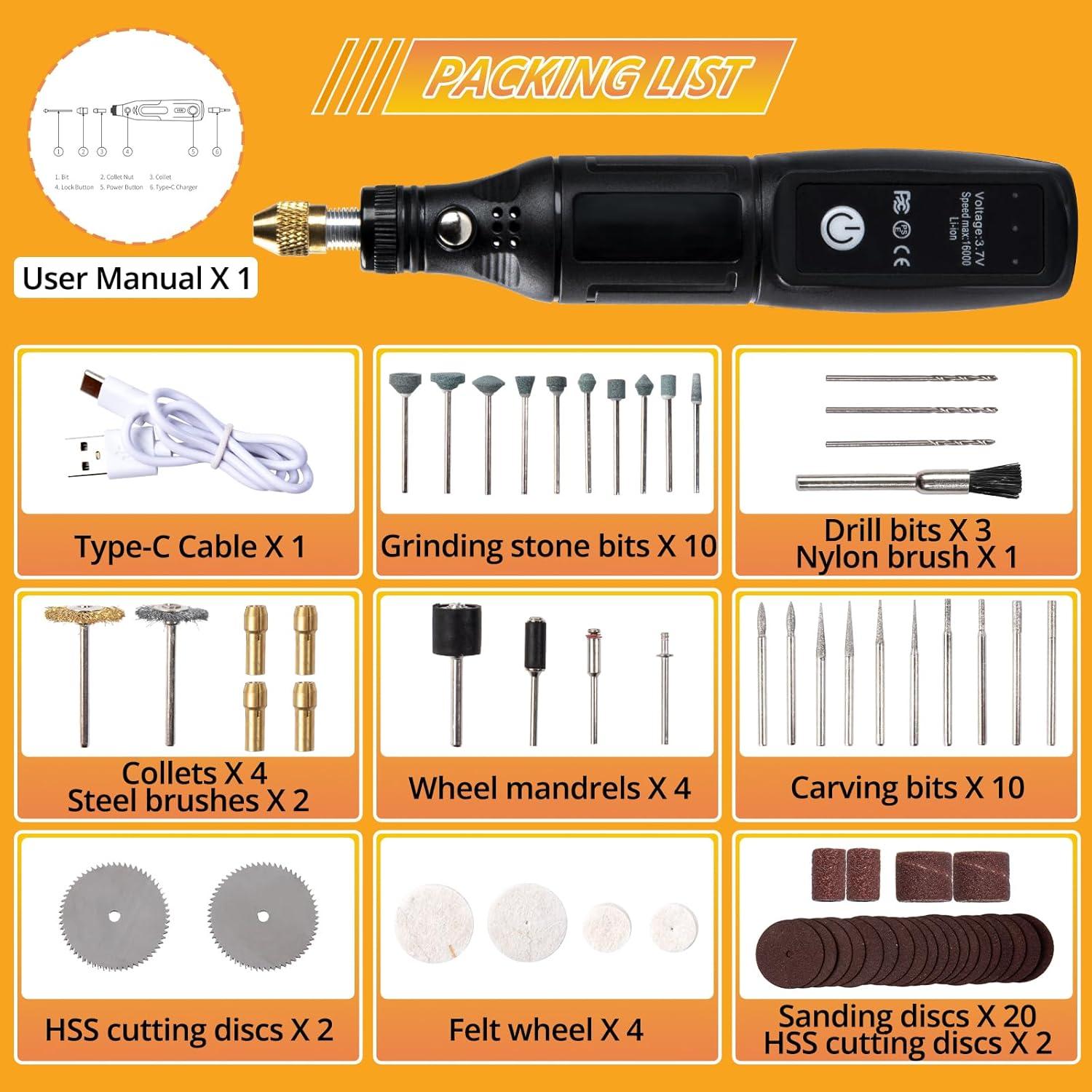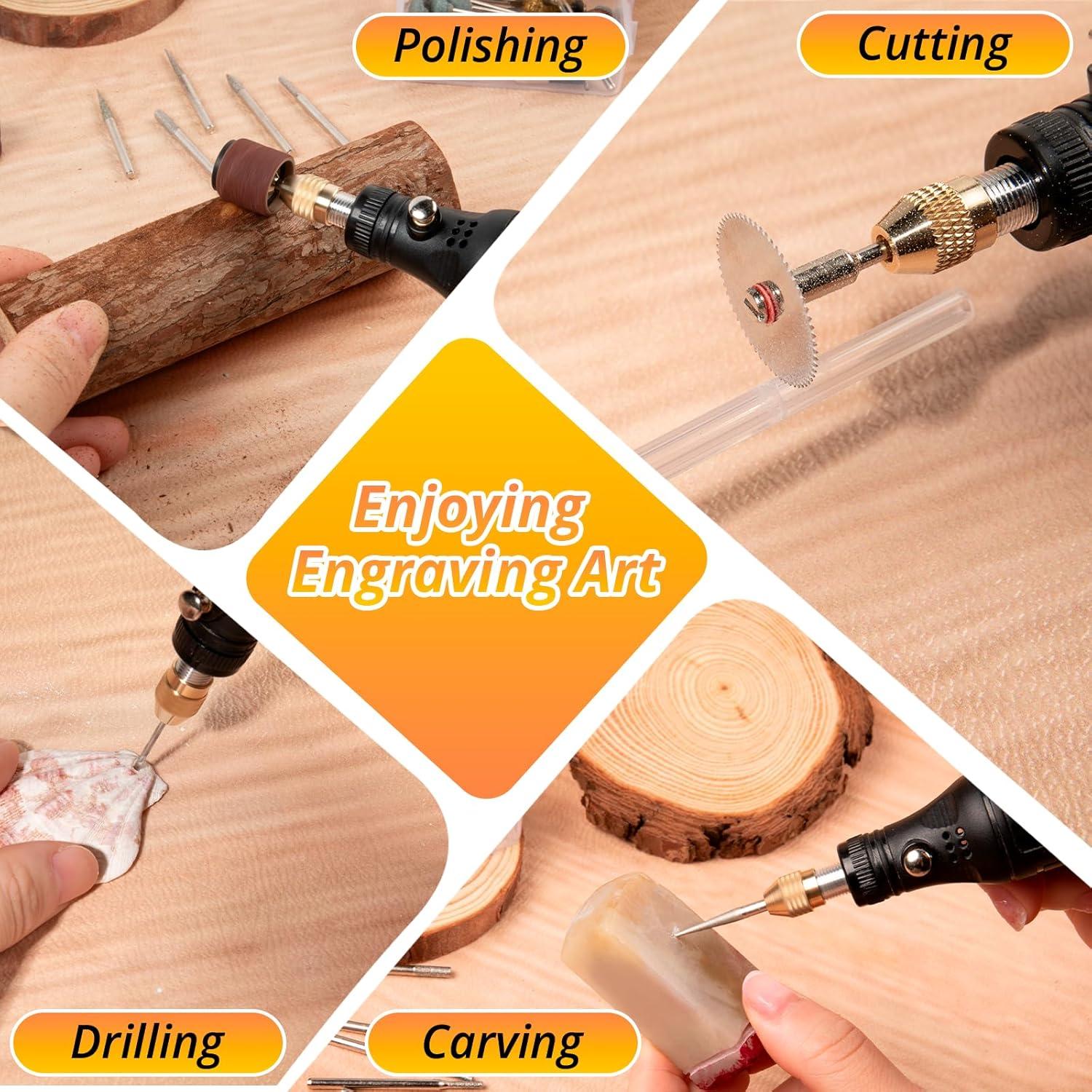 【Precision Engraving & All in One】: Our engraving pen kit has 64 accessories, including 10 grinding stone bits, 10 carving bits, 4 collets, 1 nylon brush, 2 steel brushes, 4 wheel mandrels, 4 felt wheels, 20 sanding discs, 4 sanding bands, 2 HSS cutting discs, and 3 drill bits, which integrate cleaning, grinding, engraving, cutting, etching, drilling, and polishing to allow you complete various creative needs and achieve a one-stop solution easily