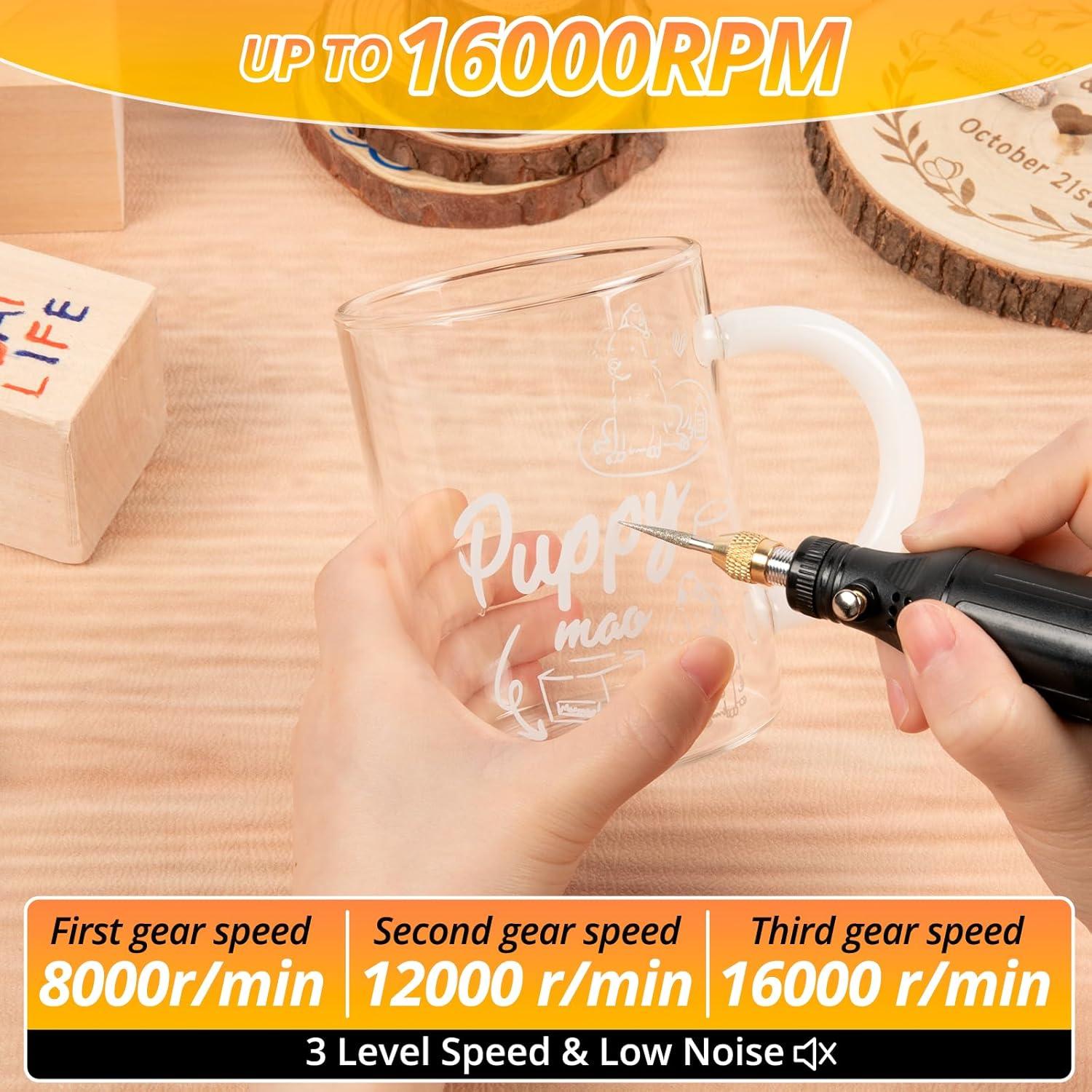 【Low Noise Operation】: The engraver pen features a three-speed adjustment (8000/12000/16000rpm), allowing for effortless control tailored to different materials and engraving requirements for optimal precision and versatility. Designed for a quiet working environment, this low-noise engraving tool minimizes sound during operation, making it ideal for use in homes or studios without disturbing your surroundings