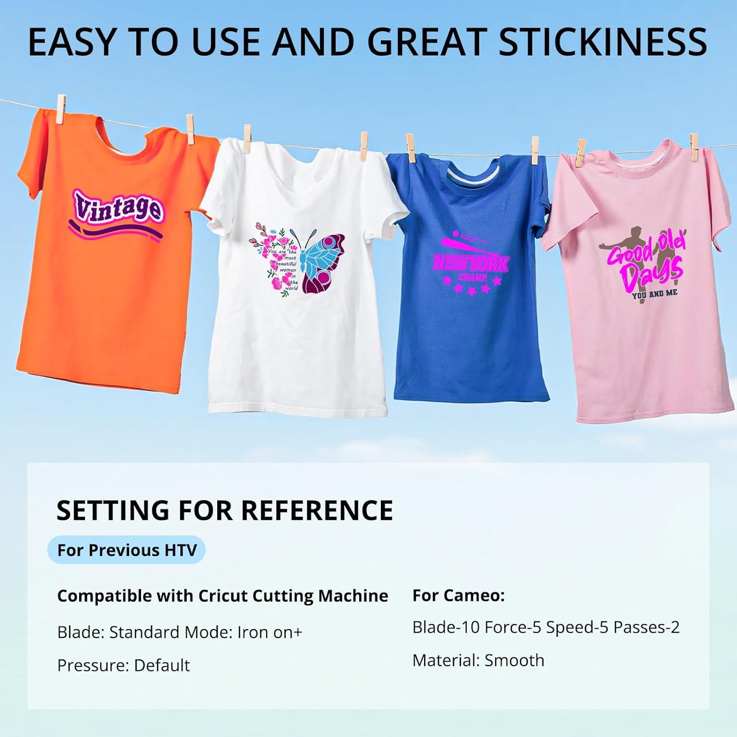【EXCELLENT STICKINESS & MACHINE WASHABLE】We upgrade the material technology of our htv vinyl bundle, it can adhere to the fabric seamlessly and has held up well in the wash without fading, peeling, and cracking. Waiting 24 hours before the first time wash, even if you wash the heat transfer vinyl repeatedly, your design will keep the same color and can not come off
