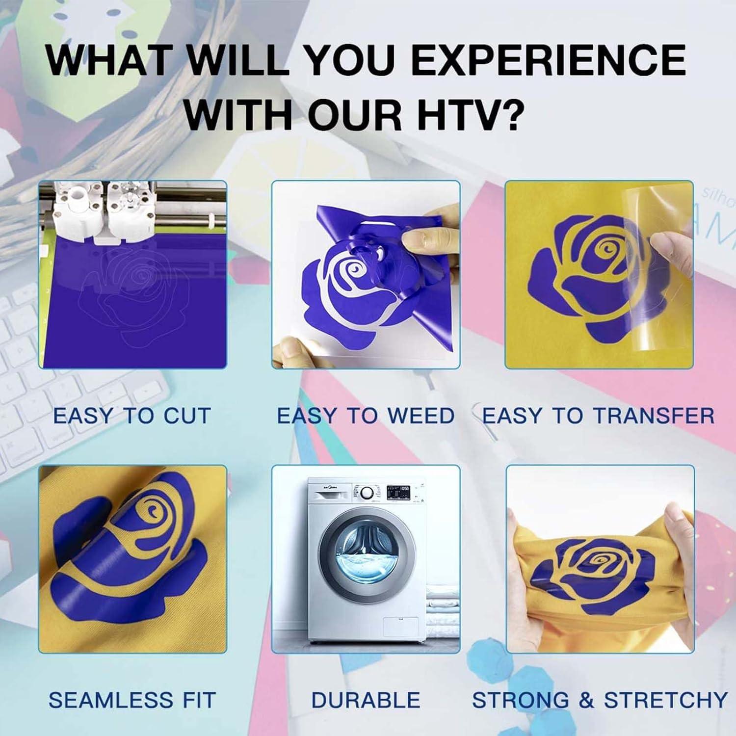 【GREAT FOR CUTTING & WEEDING & TRANSFER】This htv heat transfer vinyl bundle is made of SGS certified high-quality material, the right thickness and smoothness make it perform well in cutting and weeding. Also, our htv vinyl is temperature and pressure sensitive and can be easily heat transferred onto the desired surface