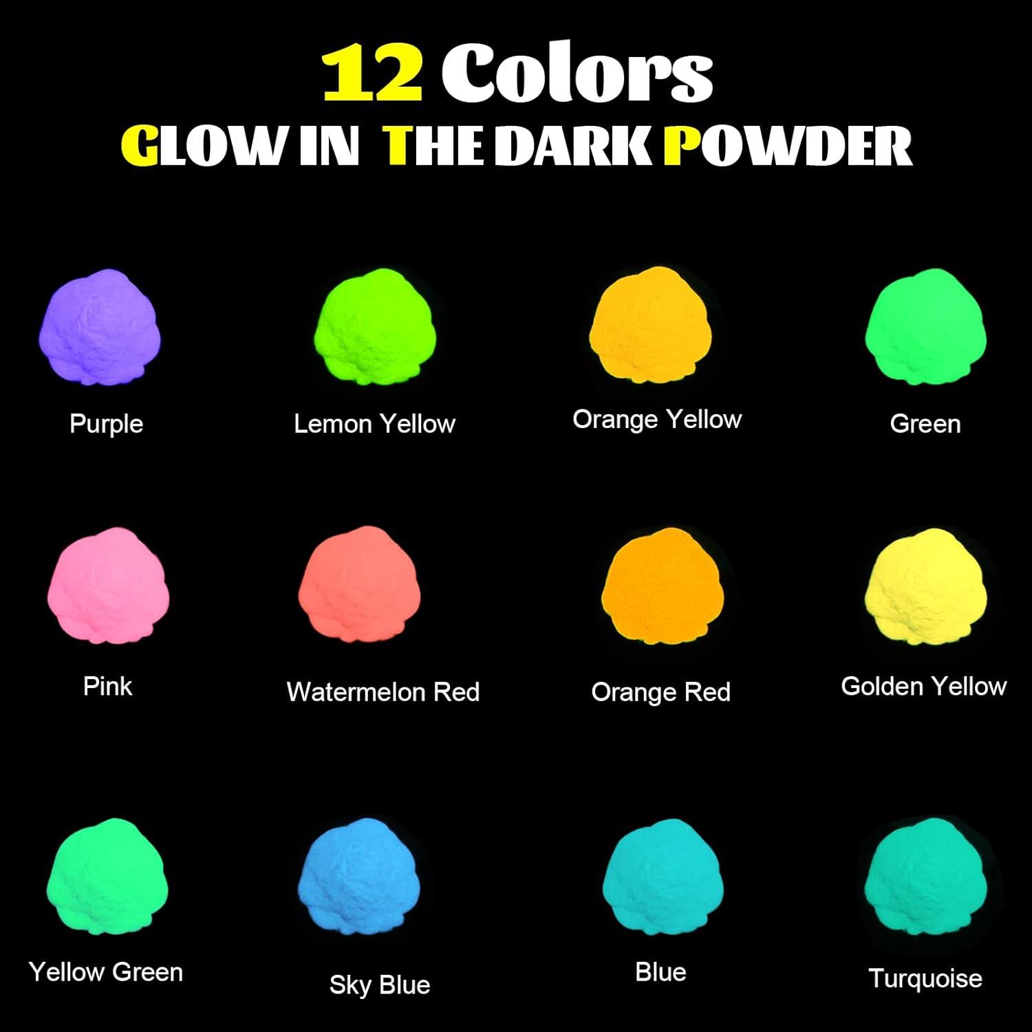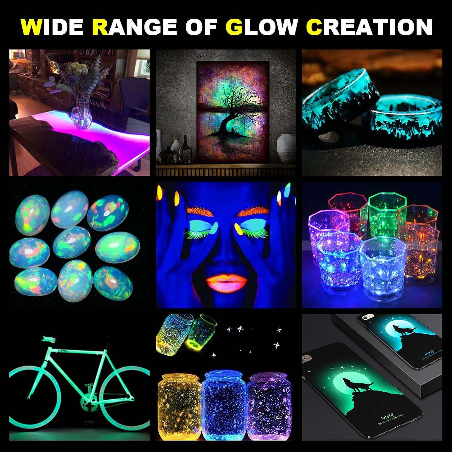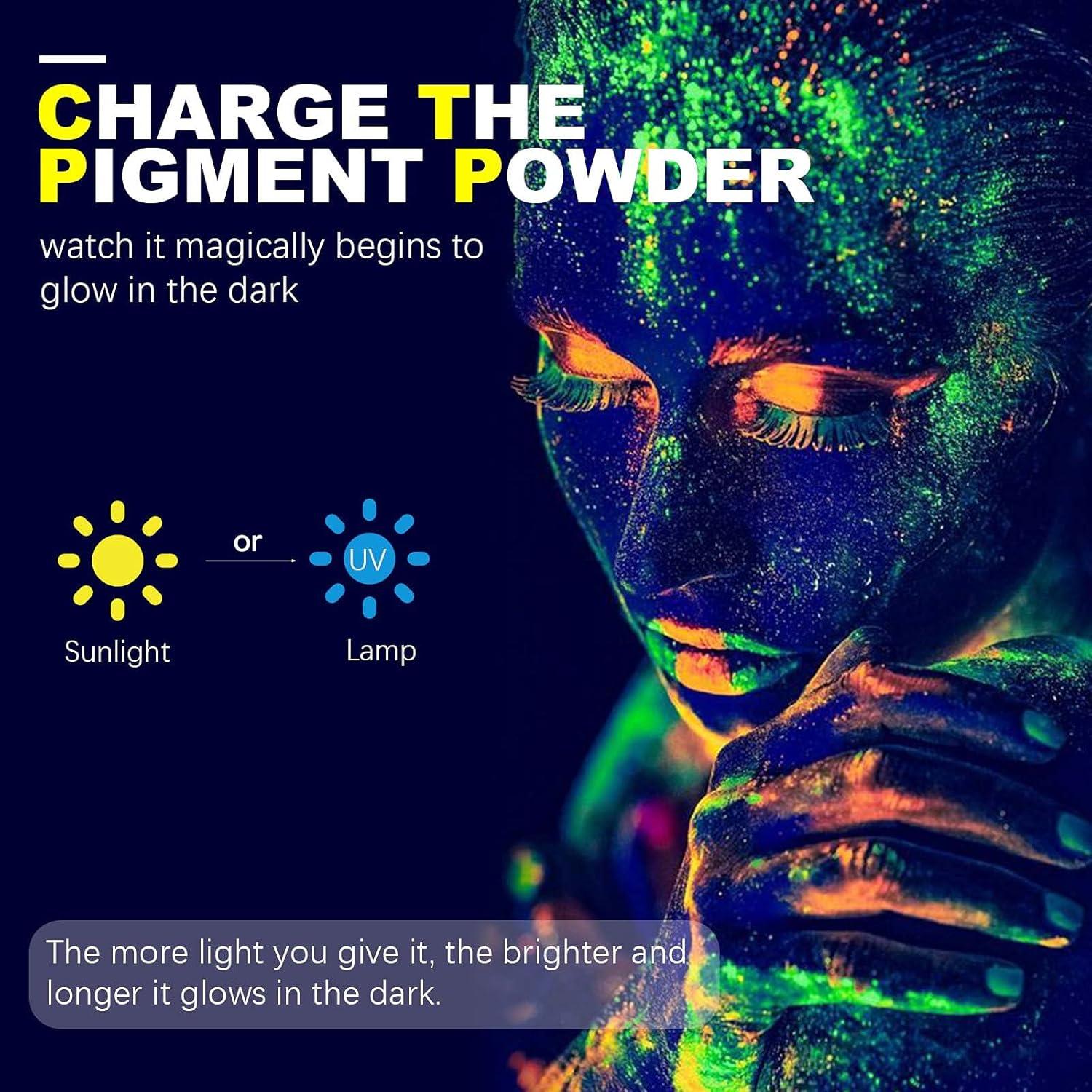 DEFINITELY GLOW: We provide one UV lamp for you to “charge” the glow powder. “Charge” the glow pigment powder with a UV lamp or sunlight. The more light you give it, the brighter and longer it glows in the dark. The different powders will glow with different colors. Please refer to our pictures. Have fun with our pigment powder
