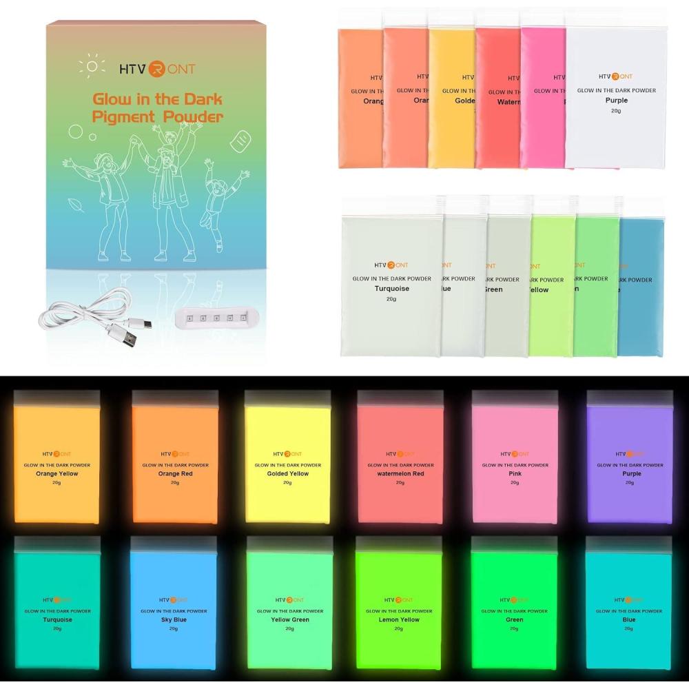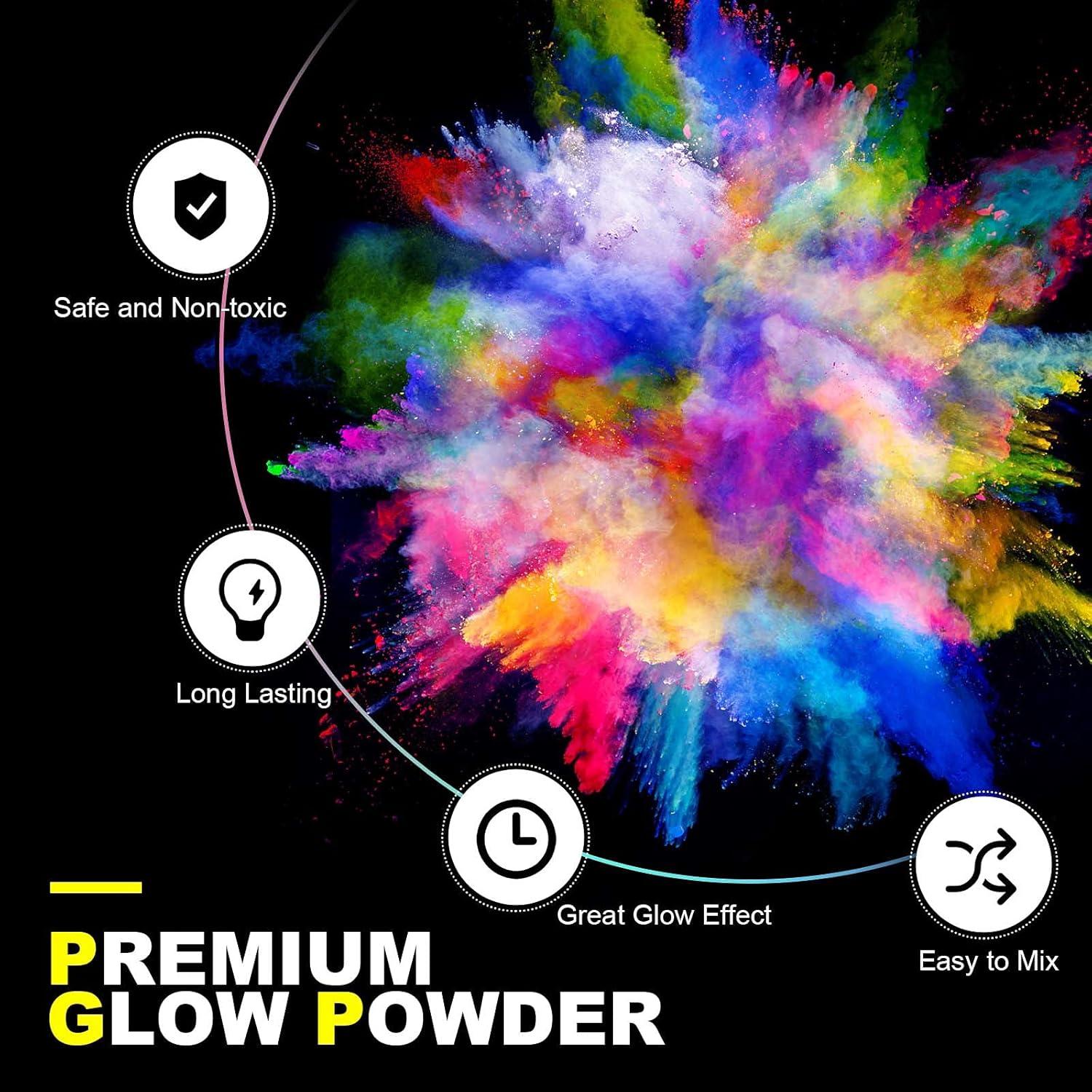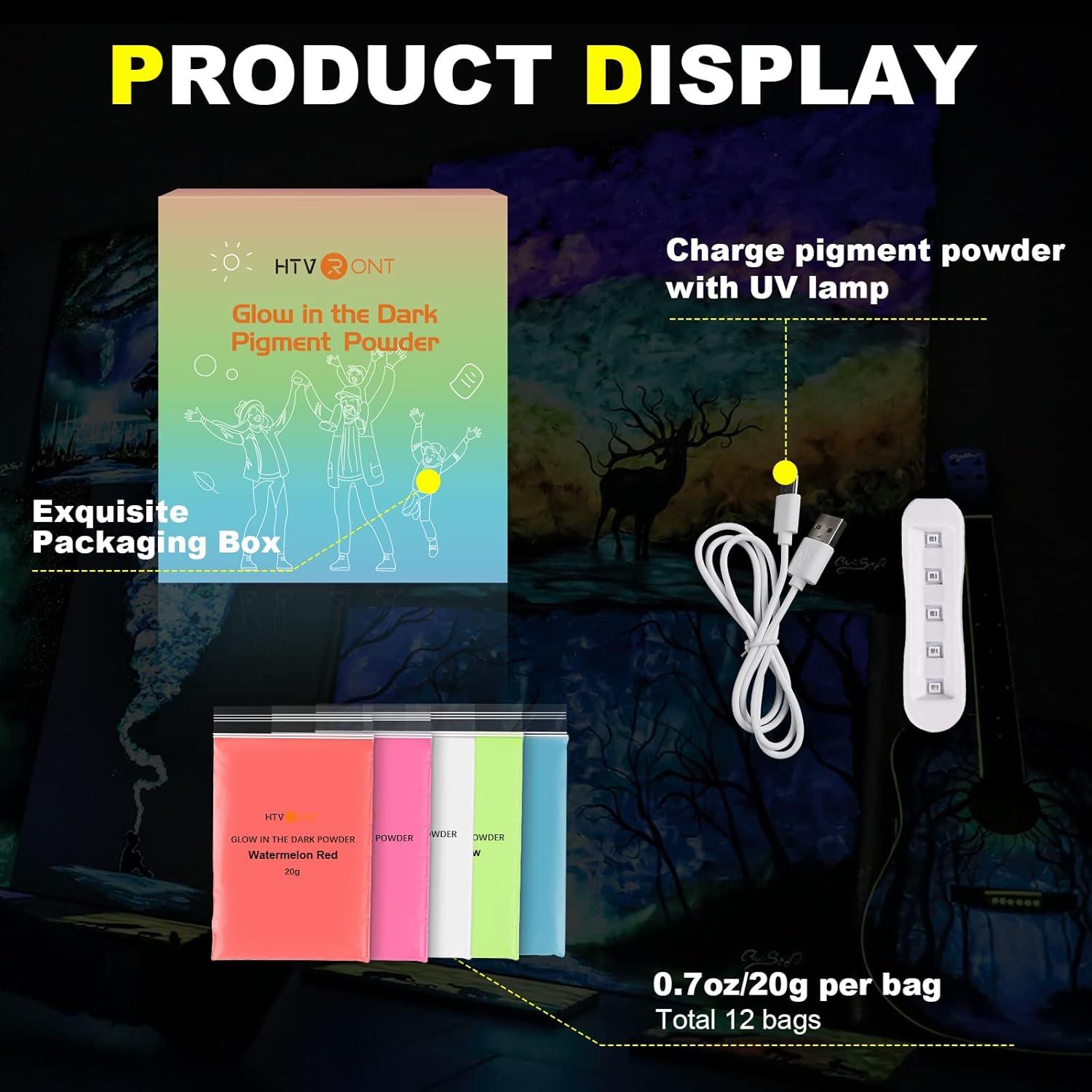 DEFINITELY GLOW: We provide one UV lamp for you to “charge” the glow powder. “Charge” the glow pigment powder with a UV lamp or sunlight. The more light you give it, the brighter and longer it glows in the dark. The different powders will glow with different colors. Please refer to our pictures. Have fun with our pigment powder