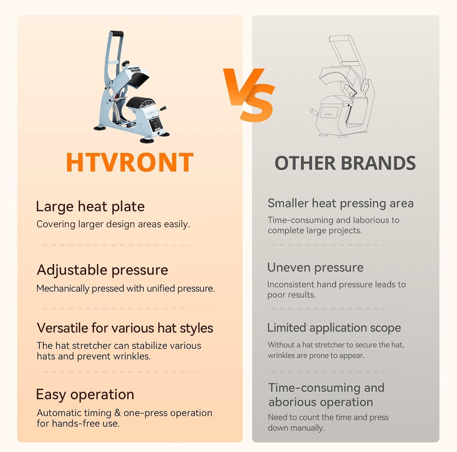 【Heats Up Quickly & Evenly】: HTVRONT hat press Machine is designed a one-piece cast aluminum heating plate coated with Teflon. Compared to silicone heating plates used in other hat heat press, the cast aluminum plate ensures more evenly heat distribution during heating pressing.It also does not produce special smell when heating press and offers a longer lifespan.