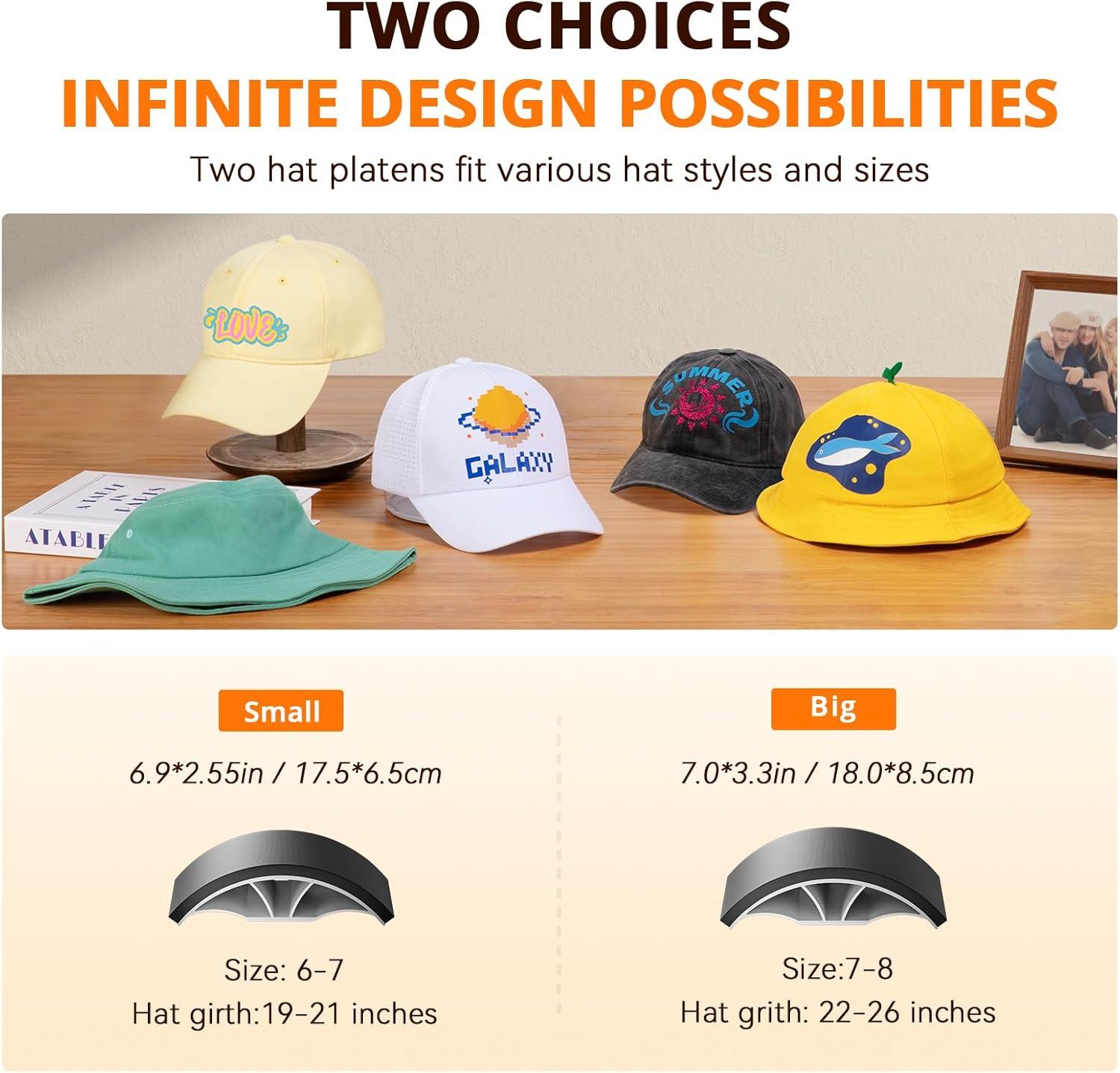 【Fits 99% of Cap Shapes】: This hat press machine is equipped with two platens 6.5 inch x 3.3 inch (16.6cm x 8.5cm) & 6.5 inch x 2.5 inch (16.6cm x 6.5cm).We improved the curvature of the cap platens and the front and back widths, making this hat heat press machine fits 99% of the hat shapes without any wrinkles(It is recommended to iron the hat flat before heating pressing)