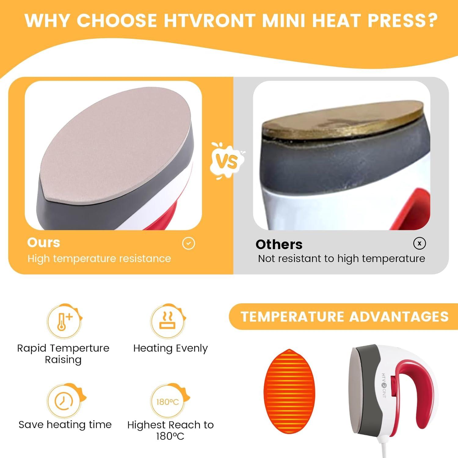 Heats Up Quickly & Safe Use: Saving 20 seconds of heat-up time compared with other brands if you use HTVRONT small heat press. Heats up fairly quickly and the handle makes it easy to keep a hold on the heat press machine so you won't burn yourself