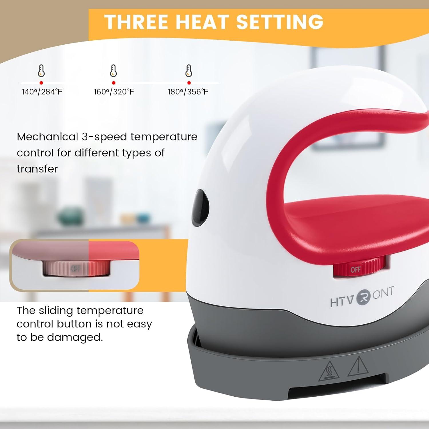 3 Heat Settings: HTVRONT Heat Press has 3 heat settings to meet your all different heat transfer demands. Low temperature: 284℉(140℃), Medium temperature: 320℉(160℃), High temperature: 356℉(180℃). Slide the knob to realize mode switching, free control of heating degree to meet your heating needs of different projects