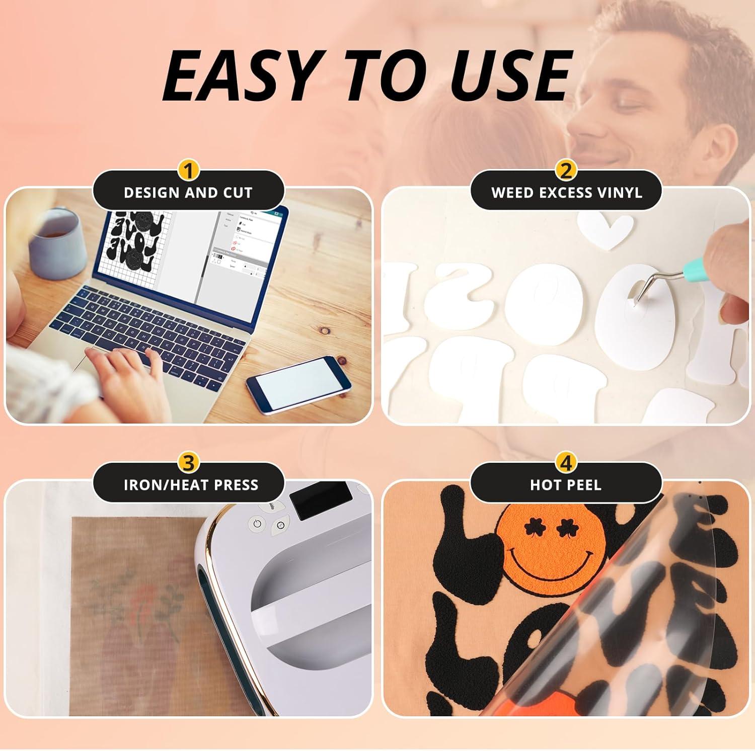 EASY TO CUT & WEED & TRANSFER: Our white HTV black heat transfer vinyl will save your time which you may waste on each image or letter, because you can cut and weed easily through the designs just right.The white htv vinyl is sensitive to temperature and pressure, which can be heat transferred on any t-shirt easily