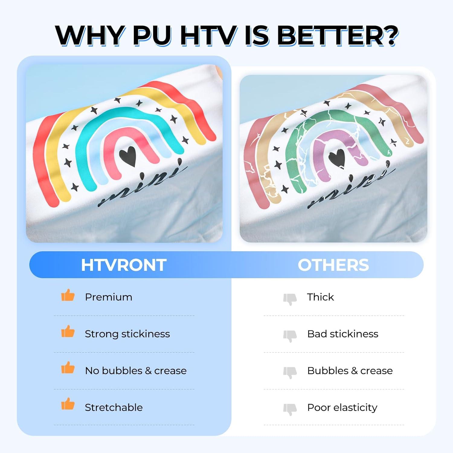 【GREAT STICKINESS & DURABLE】HTVRONT heat transfer vinyl features a high-tack carrier that adheres seamlessly to fabrics. The iron on vinyl roll maintains strong adhesion and durability even after repeated washes, resisting fading, peeling, and cracking. After washing, the htv vinyl retains its color and shape without deformation, while preserving elasticity and flexibility. Tips: cold peel recommended. Reverse wash will be better. Wait 24 hours before its first wash