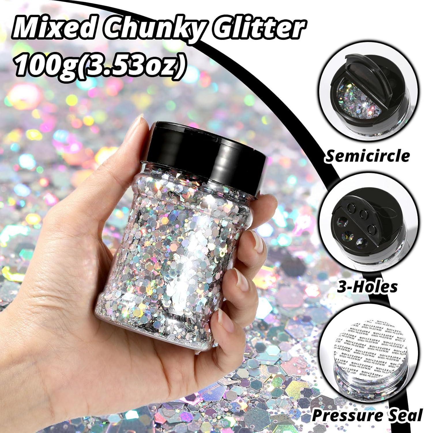 LARGE BOTTLE FOR WIDE USAGE. 100g/jar(2.17*3.35inch), this chunky glitter for resin is suitable for long-time use. Meanwhile, our excellent chunky glitter displays high compatibility with resin, tumblers, nails, decor, painting, scrapbooking, jewelry, school projects, etc. This holographic glitter chunky works well with glue and epoxy to make sparkle crafts, which let your artworks stand out beautifully