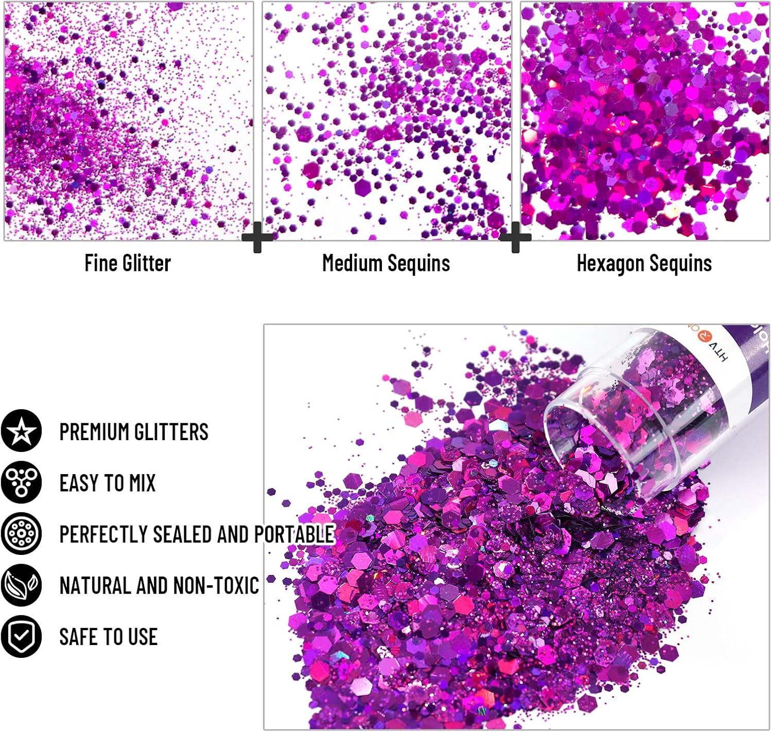 STUNNING HOLOGRAPHIC EFFECT. Mixed different size hexagonal sequins and fine glitter, our holographic glitter performs an extraordinary effect different from ordinary craft glitter. This chunky glitter for crafts offers a metallic finish while providing a secondary rainbow finish. It shines differently in dazzling colors in different light angles, taking on a sparkling holographic color. Add sparkle, shine, and texture effects to your projects
