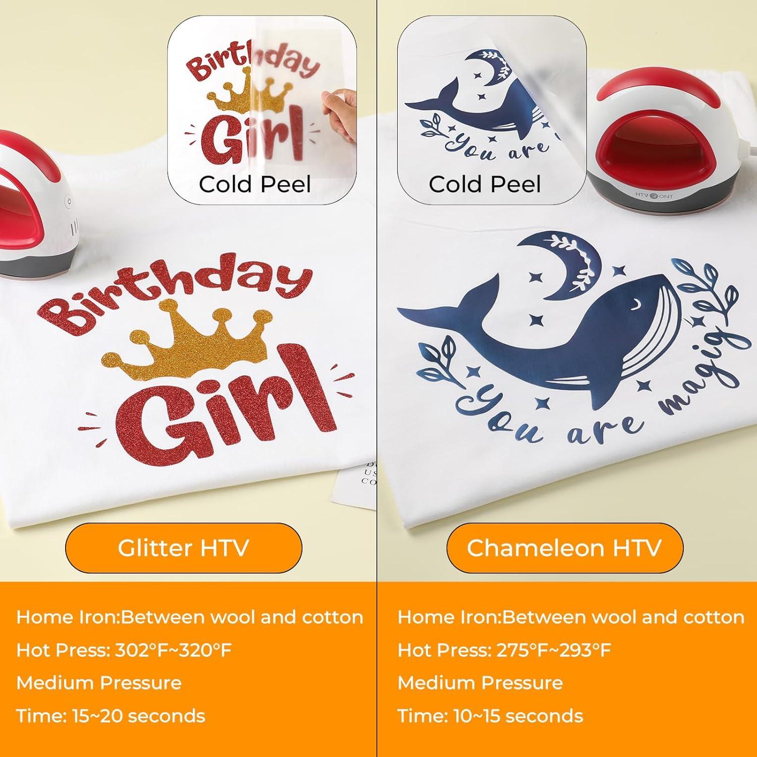 【Durable and Machine Washable】Our 18-piece HTVRONT heat transfer vinyl set includes three versatile types: richly colored PU HTV with strong adhesion, dazzling glitter HTV for a lasting sparkle, and iridescent chameleon HTV that shifts colors with light. Each film delivers a professional, durable finish that stays vibrant and intact wash after wash—no cracking or peeling. For best results, allow 24 hours after applying before washing