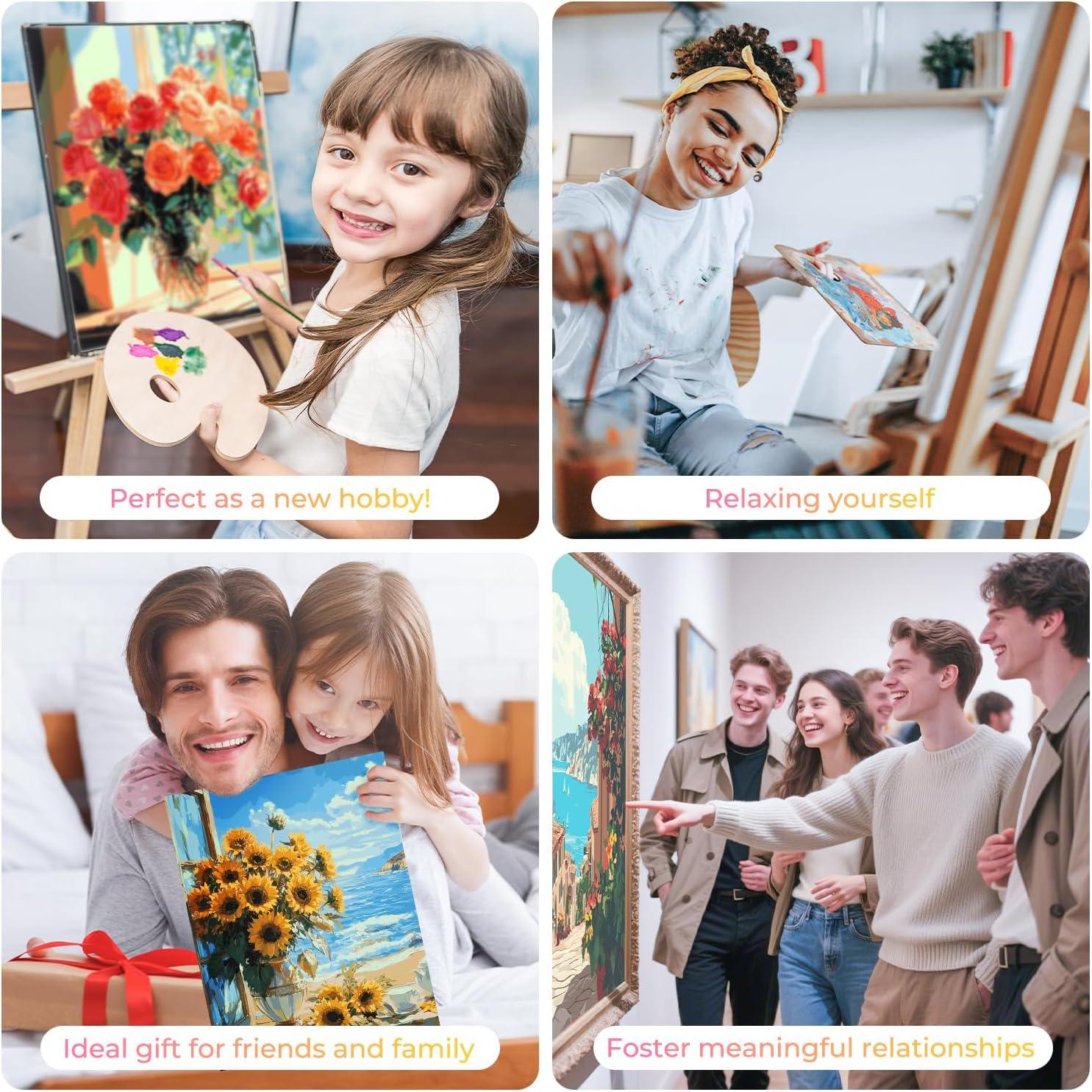 RELAXING & PEACEFUL ACTIVITY: Creating a beautiful paint by numbers masterpiece not only enhances your artistic eye, but also turns quality time with family and friends into a more delightful experience. The kit includes: HD color canvas x 1; number reference paper x 1; brushes x 3; paint kit x 1; small finished painting reference x 1; hooks x 2