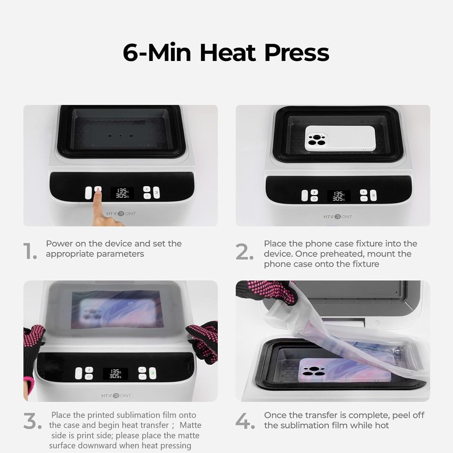 3D Full-Wrap Vacuum Heat Press : HTVRONT H17 heat press for cell phone cases equipped with advanced intelligent temperature control and vacuum heat press technology, delivers vibrant, bubble-free transfers. The heat press for phone cases fully wraps patterns around phone case sides and curves to eliminate unsightly edges for a pro finish. Works brilliantly on badges, coasters, keychains, and ceramic pieces too. Please note this heat press machine can only be applied to items with sublimation coating.