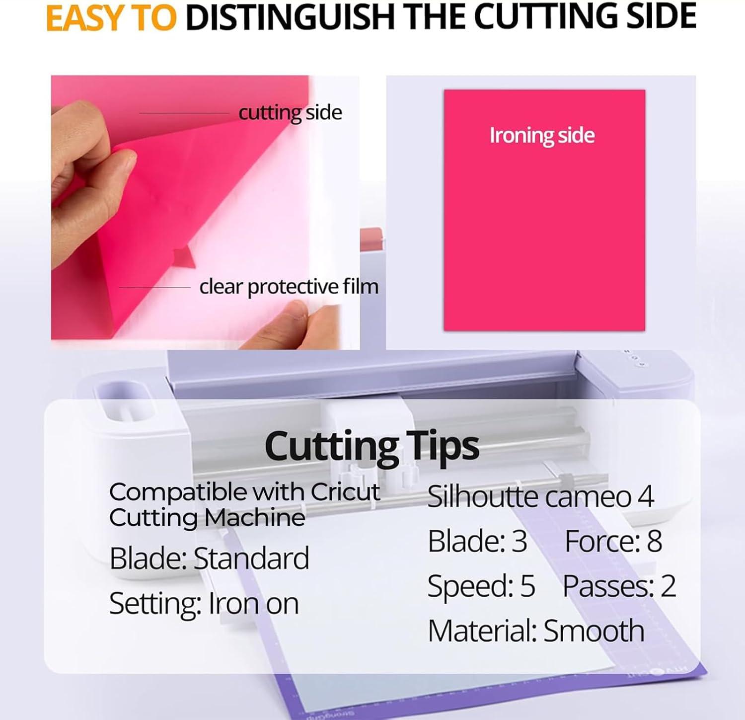 【EASY TO CUT & WEED & Transfer】The pink htv heat transfer vinyl bundle is smooth and thin, so it is easier to cut and weed, which saves the time you may waste on each image or letter, and even complex designs can be transferred perfectly. Our iron on vinyl for t shirts can be compatible with Silhouette Cameo, Cricut Maker and Heat Press, very easy to use, you can easily create unique and personalized design.