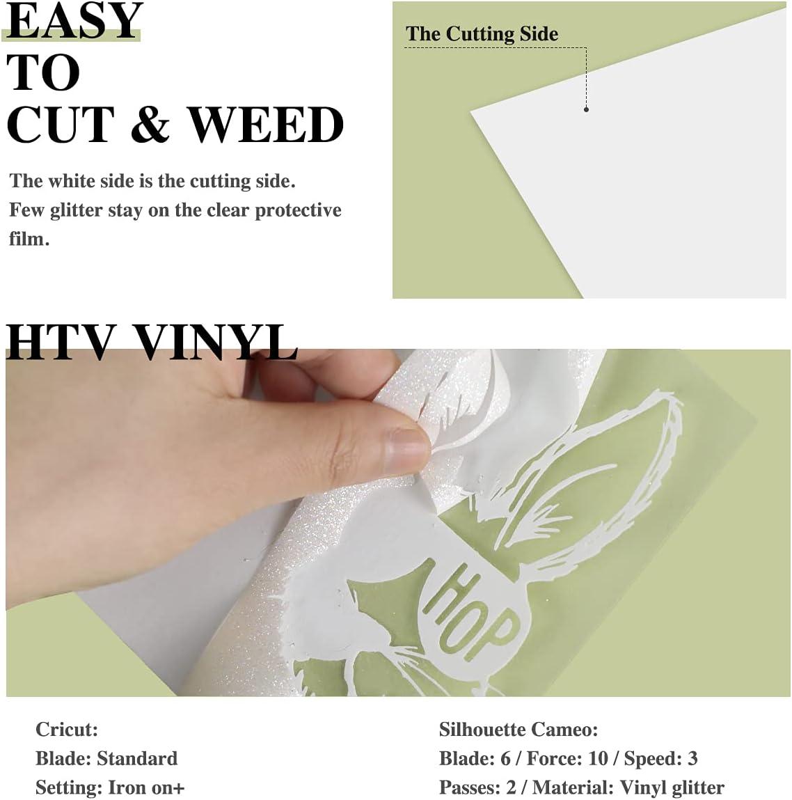 【SUPER EASY TO CUT & WEED】Our glitter htv heat transfer vinyl bundle has very good cutting characteristics. The white side is the cutting side. The TPU material is easy to cut by cutting machines such as Cricut explore air 2, Cricut Maker, and Silhouette Cameo. Also, it is easy to weed the excess vinyl and few glitters stay on the clear film. Super easy to use even for the new beginners.
