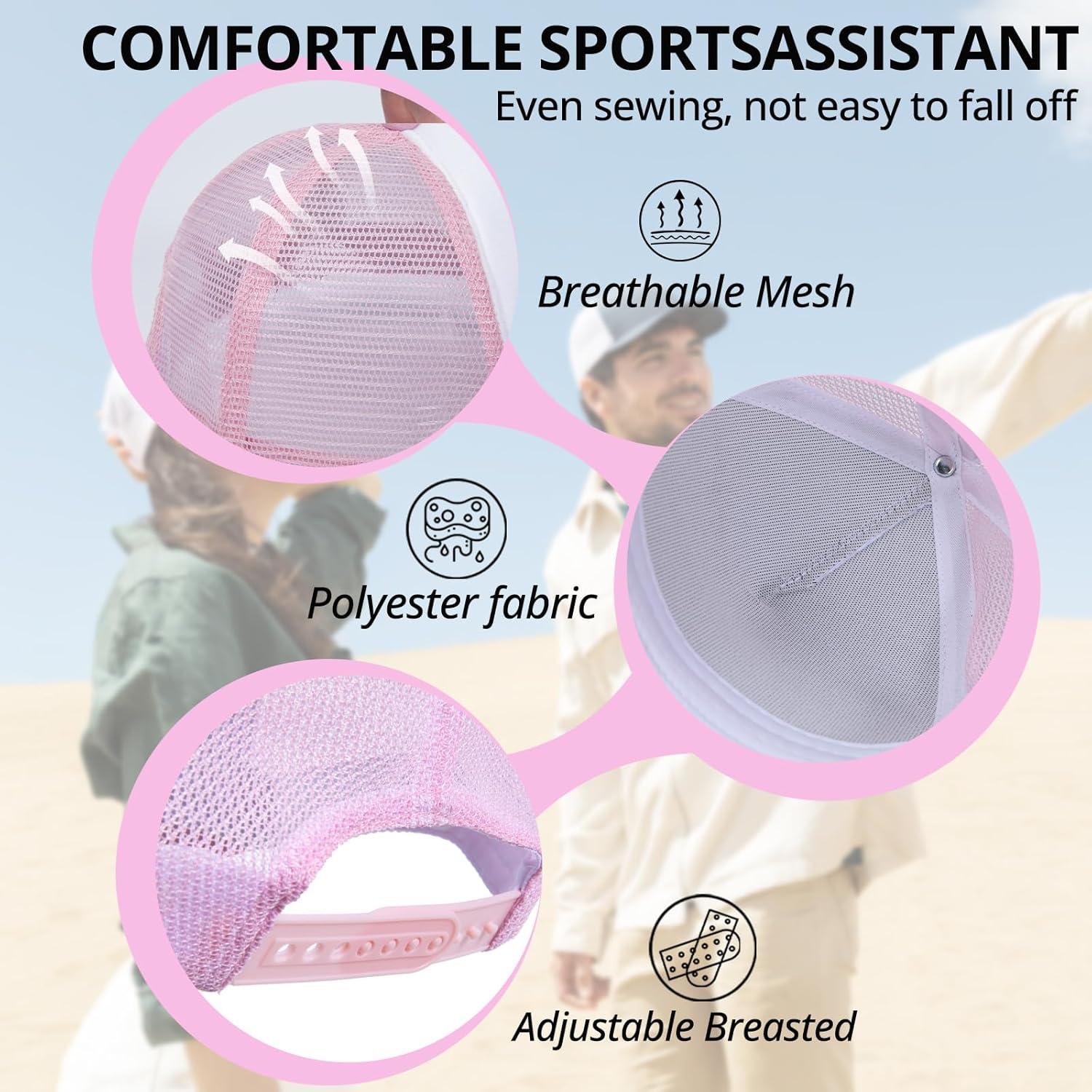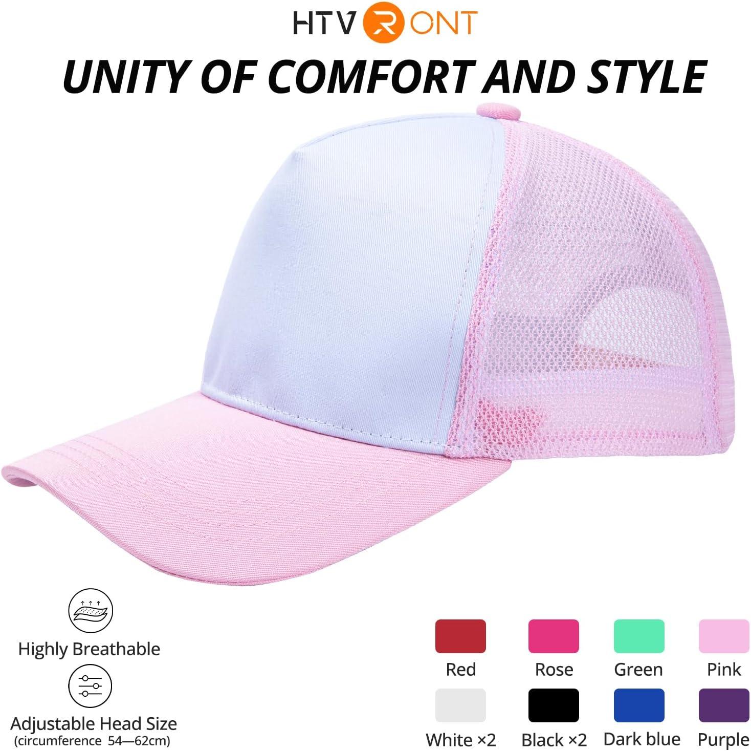 【8 Colors & Polyester Materials】HTVRONT sublimation hats sponge 10pcs: white × 2, black × 2, red, rose, pink, fluorescent green, blue, yellow. The front of the trucker hat is made of polyester material, and the back is a breathable mesh design – improving the comfort of exercise effectively