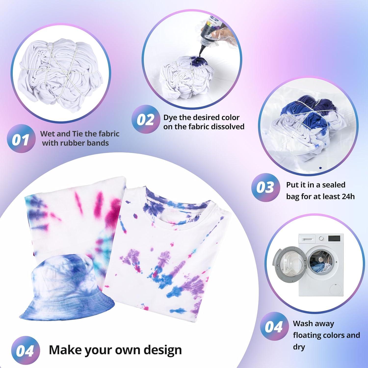 NON-TOXIC & KIDS SAFETY: Our tie die set kit adopts natural material, non-toxic, tasteless and has passed multiple strict test. What's more, tie die kit is pre-filled, no need to add powder by hand to aviod mess and the water line is marked on the tie-dye bottle for easy operation. It is recommended that children under 6 years old use this tye dye kits for clothing in the company of an adult and enjoy the fun of fabric dying together
