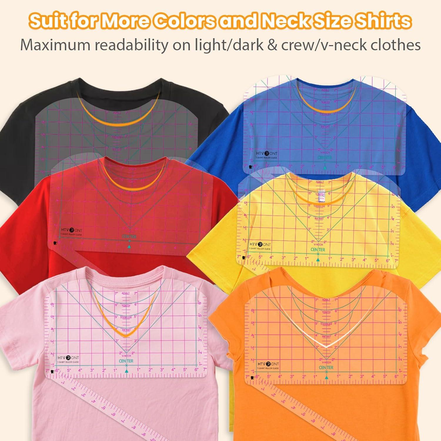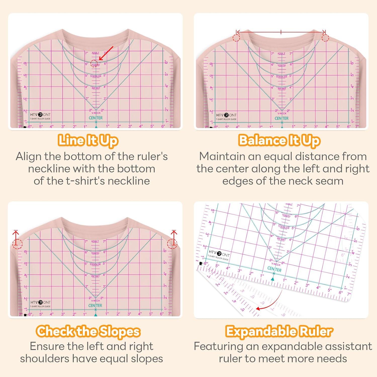 VERSATILE & ALL-AGES SIZING: Introducing the HTVRONT 14″x8″ Extra Large Tshirt Ruler Guide, ideal for vinyl alignment. Its clear markings align effortlessly with shirt necks, and its flexibility caters to infants to adults, fitting various collar styles including round and V-necks. Additionally, the expandable tshirt ruler design allows precise decal application anywhere on shirts. T-shirt ruler guide is perfect for heat press accessories